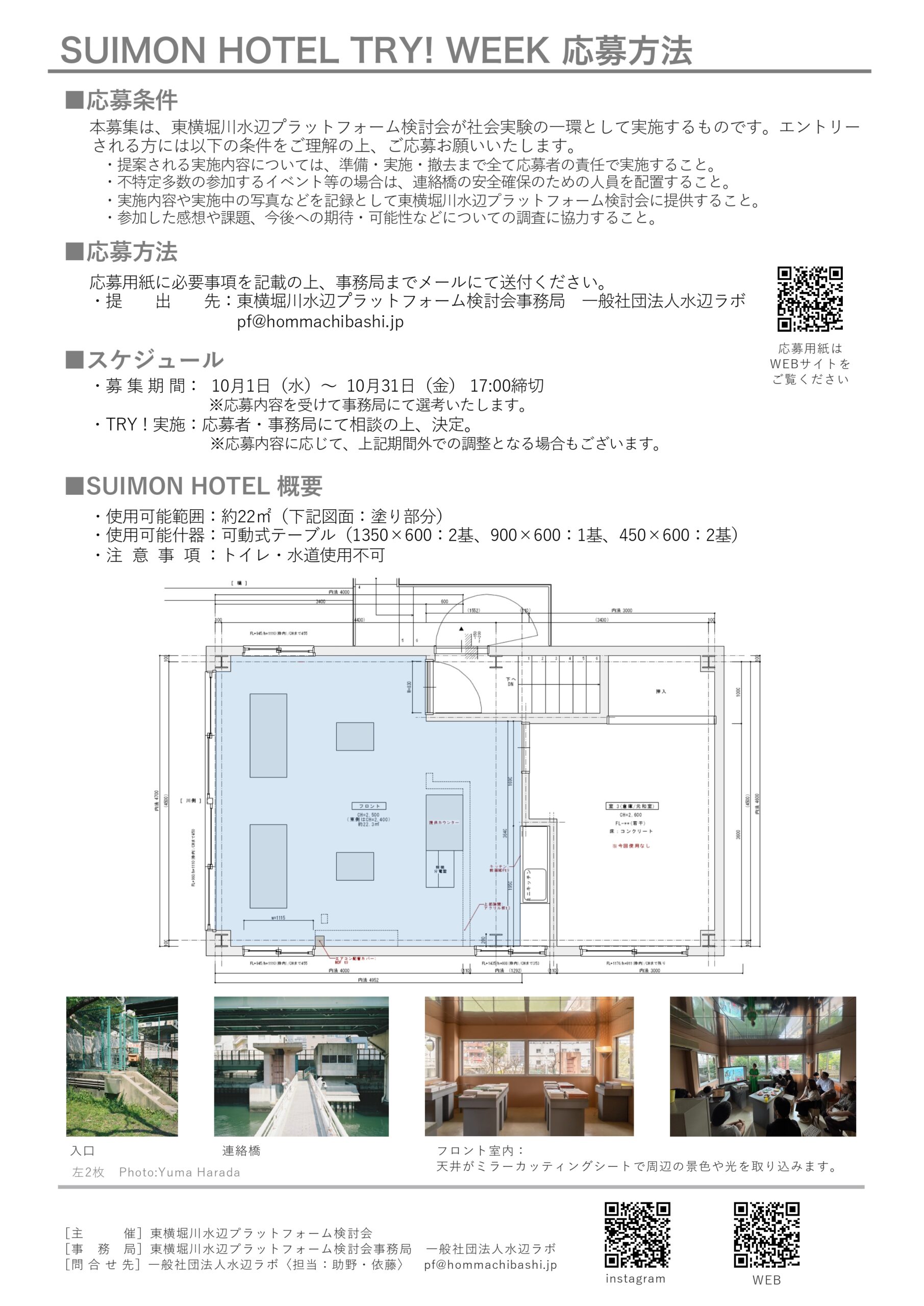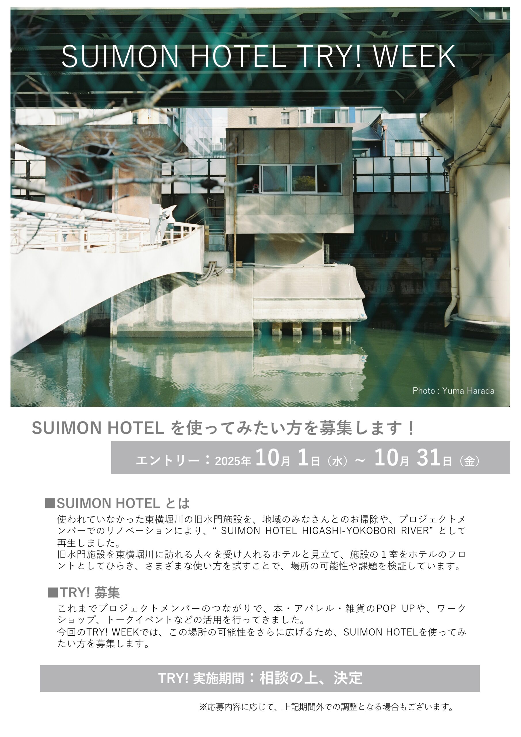 今回のTRY! WEEKでは、この場所の可能性をさらに広げるため、SUIMON HOTELを使ってみたい方を募集します。